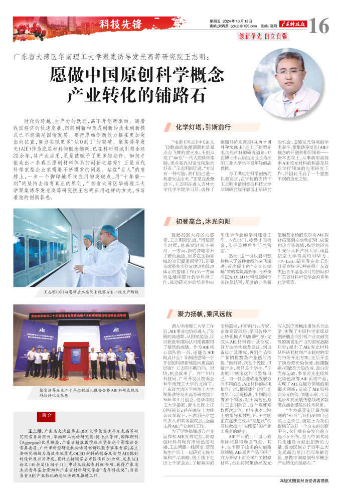广东省大湾区华南理工大学聚集诱导发光高等研究院王志明: 愿做中国原创科学概念 产业转化的铺路石