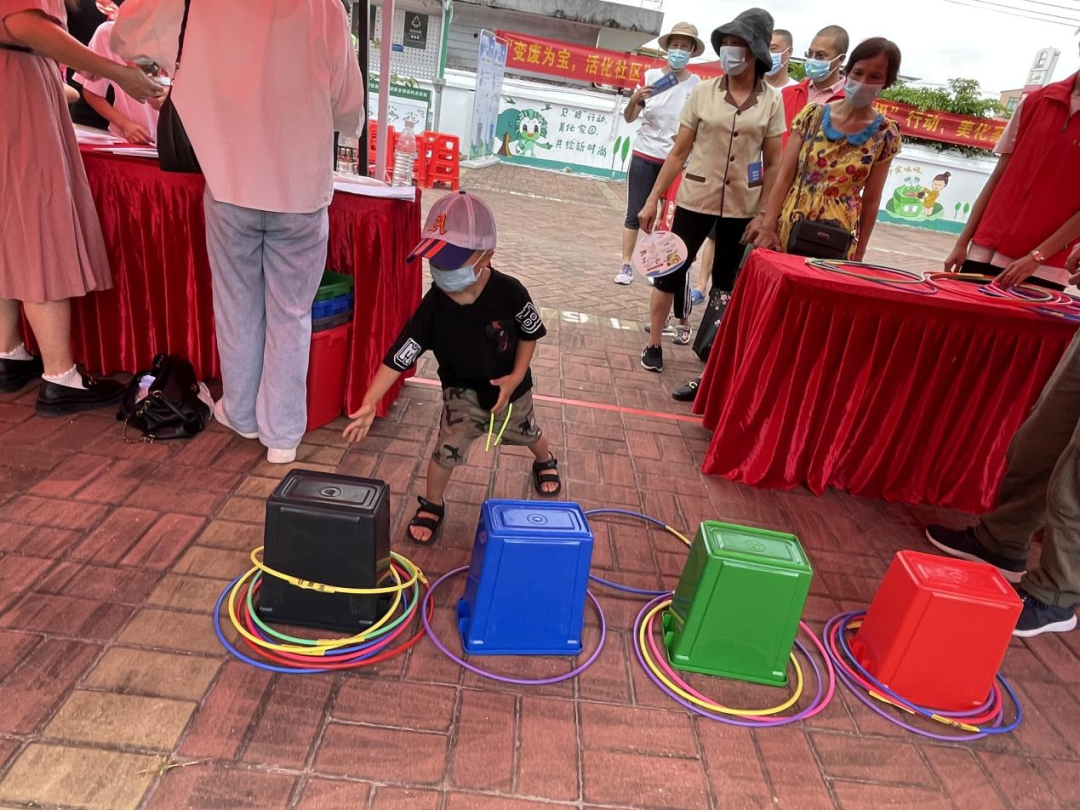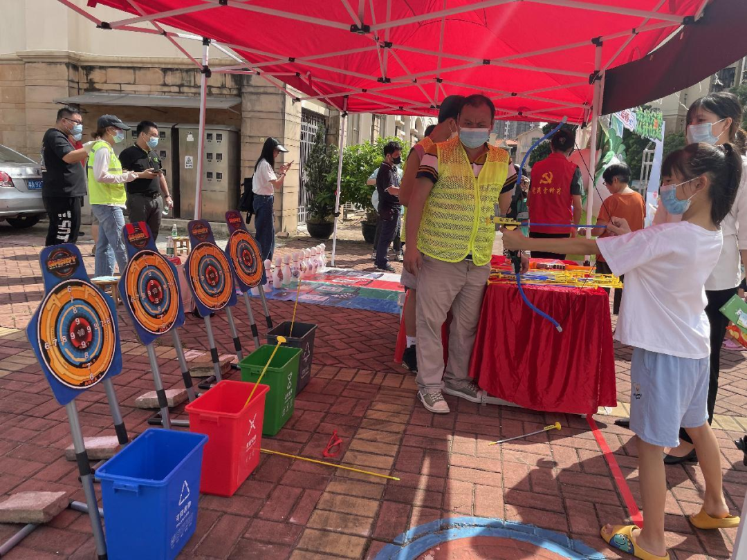 游戏互动环节更是精彩纷呈,有分类模拟投放、分类保龄球、分类射箭、分类套圈圈等环节。游戏摊位前热闹非凡,居民拿着游戏卡,积极参与各个游戏环节,集齐印章即可兑换礼品。