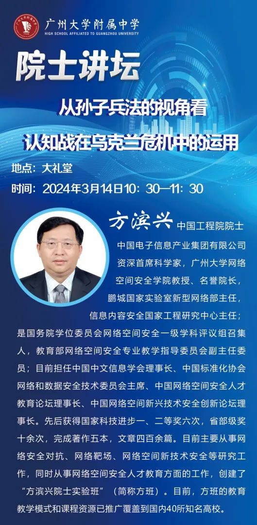 3月14日,广大附中邀请“中国网络防火墙之父”、国家计算机网络与信息安全管理中心名誉主任、中国工程院方滨兴院士莅临广大附中“院士讲坛”,为同学们带来精彩讲座!