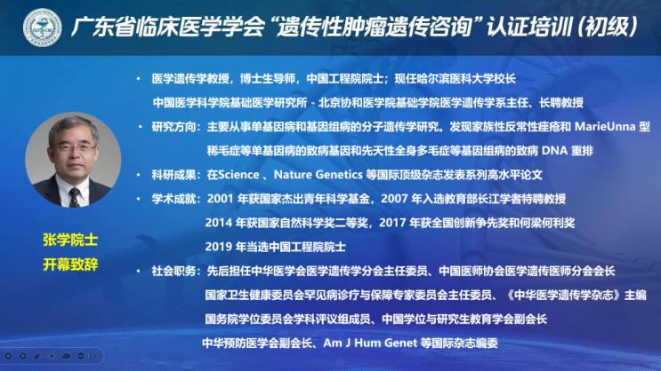 中国工程院院士张学在开幕致辞中表示,遗传性肿瘤是可防可控的疾病,它遵循经典的孟德尔遗传方式,遗传性肿瘤遗传咨询工作对于遗传性肿瘤的防治有着非常重要的作用。在基因组学和遗传学技术广泛应用、广泛影响着民众健康和临床各学科发展的今天,遗传性肿瘤遗传咨询是时代的趋势,也是技术发展的要求,感谢陆国辉教授及主办方精心准备与策划的培训活动,认真编写培训教材,用心制定课程大纲,组建教师队伍,搭建平台广泛交流,征求意见,互相讨论,达成共识,相信在各位同仁的共同努力下,一定能够推动遗传性肿瘤防控事业不断向前发展,为健康中国2030规划的实现贡献我们的智慧和力量。